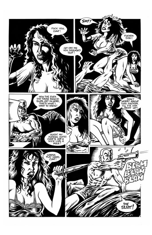 Spore Whores is set in an apocalyptic future where a devastating and insidious reproductive virus infects humanity. No one knows its origin, nor is there a cure. But its effects are obvious: infected women become riddled with the virus and are driven by a feverish rage to pass its malignant spores onto men through intense sexual activity. Meanwhile men infected by the spores turn into mutated monsters, carriers of the spores, looking for female victims to pass the spores to. And so the cycle continues…